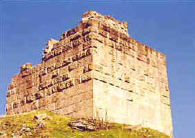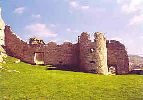 | Samozřejmě že „castrum" ranného 12. stol. nesestávalo jen z obytné věže. Lze předpokládat dodatečné obranné zařízení, čemuž skutečně odpovídá nástavba vnější hradební zdi v bezprostřední blízkosti paláce. Přímo na obytnou věž navazuje hradba, která je přistavěna k západnímu rohu s krátkým přesahem střešní krytiny a ohraničuje jihozápadně umístěný volný prostor malé vrcholové plošiny. Zatímco jsou dvě strany zachovány až do výše cca 2 m, je jihovýchodní průčelí zbořeno. Hradební pás mohl vzniknout teprve po výstavbě obytné věže a tvořil zřejmě malý uzavřený přední dvorek. O umístění vstupní branky neexistují žádné informace. Také štítová hradba předsunutá na jihovýchodě před palác a nazývaná kvůli své obzvláštní ochranné funkci „vysoký plášť", vykazuje srovnatelné zdivo. Táhne se podél hrany žulového výchozu a cloní palác nad níže položenou náhorní plošinou. Ačkoliv čelní hradba už nestojí v plné výši, její mohutná zřícenina hodná obdivu jako by tvořila přímé pokračování svislé skalní stěny. |