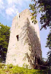 | Vnitřní bránou se vstupuje na dolní nádvoří, které je na západní straně chráněno o něco výše položenými hlavními budovami obklopujícími horní nádvoří. Z románské brány, vedoucí k hornímu nádvoří, zůstala zachována pouze dolní část ostění. V severovýchodním rohu horního nádvoří se zvedá hranolový bergfrit, který se nyní restauruje. Věž byla mezi lety 1897 až 1902 zvýšena z původně zachovaných 11 m tak, aby mohla sloužit jako rozhledna. Spodek stavby je na severní a částečně také na východní straně od současné úrovně obložen sedmi vrstvami středně velkých a velkých kvádrů. Nad nimi začíná obezdívka z lomového kamene s nárožními kvádry, mezi nimiž se objevují ojediněle bosované kvádry. Na západní a jižní straně má věž také obezdívku z lomového kamene. Vnitřek věže je obložen kvádry až do výšky nové přístavby. V nedávné době byl dole proražen vchod a zaklenut lomeným obloukem. Starý vchod se nachází, jak je u takových věží obvyklé, ve výši cca 9 m na jižní straně odvrácené od možného útoku. I ten je ukončen lomeným obloukem. |