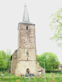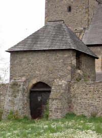 | Na severní straně chóru sakristie zpočátku 16. st. Čelní vysoká hranolová věž s jehlancovou helmicí přistavěna rovněž až v 16. st. Románský ústupkový portál na jižní straně lodi ze II. čtvrtiny 13. st., sloupky ukončeny hlavicemi s bohatým listovým dekorem (cisterciáci), po obou stranách portálu odlišně uspořádanými. V půlkruhovém tympanonu reliéfní úponky vinné révy, archivolta s válcovými pruty. | |