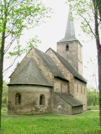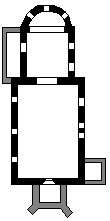 | Jednolodní obdélný kostel s kvadratickým presbytářem a půlkruhovou apsidou. Obdélná loď plochostropá, pravoúhlý chór (v 19. st. zvýšen) s apsidou zaklenutou konchou. | |
