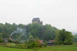 | Ta první vysvětluje jméno hradu i predikát podle kořisti bájného předka rodu rytíře Biwoje, který na tomto místě skolil kapitálního kance. Podle jiných pověstí byli naopak kapitální kanci někteří z majitelů hradu. A nakonec jedna varovná pro alkoholiky. Rytíř Konrád se rouhal - jestli už ho má odnést čert, tak ať je to při pijatyce a ať má při tom pohár v ruce, aby si ho užil a nemusel se s ním rozloučit. No a v tu ránu uhodilo, blesk trefil pána hradu a ten se svalil mrtev. Pohár se roztavil a oblil mu ruku, takže ho museli pohřbít i s ním. Rozloučit se s ním nemusel, ale jestli si ho užil, to nevíme..... |