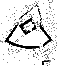 | Jen o málo později byla vybudována obvodová hradba, uzavírající trojúhelný areál hradu. Vstupní brána byla prolomena v obvodové hradbě na jihovýchodě. |
