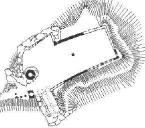 | Z důvodu špatného stavu zříceniny a neúplného zakreslení dodnes provedených výzkumů je složité rekonstruovat uspořádání hradu v počátečních fázích jeho výstavby. Základ první pevnosti tvořila osmiboká věž, zbudovaná z tesaných kvádrů na vrcholku skalního výběžku. Třípatrová věž měla přibližně 13 metrů na výšku. Pravděpodobně ze 14. st. pochází rovněž obvodová hradba, „běžící po hraně návrší“ a rozdělující rozlehlé nádvoří, na část východní (obdélného půdorysu) a část západní (nepravidelného půdorysu). |