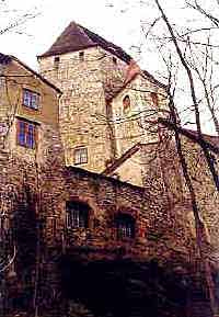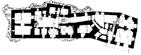| Sklepní prostor 3-podlažního paláce je osvětlen pouze malými štěrbinovými okny. Z doby výstavby pochází také trámový strop. Na kulatém oblouku brány vedle paláce se zachovaly unikátní kamenické značky. |