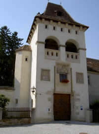 | Průčelí západního traktu, zakončené dvoupatrovou branskou věží nad průjezdem do nádvoří, bylo upraveno kolem r. 1900. Zašlou slávu této části hradu potvrzuje pouze mohutný, segmentový, pozdně gotický oblouk v bráně. Datum výstavby je, dle letopočtu na fasádě, z r.1578. Nad datumem se nachází erb rodu von Abensperg-Traun s datem 1557. | |