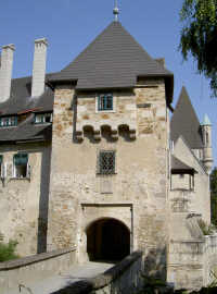 | Hradní areál je rozdělen na opevněné předhradí (dolní hrad) a poměrně mohutný horní hrad. Přístup k hradu vede od jihu, kde se dříve nacházel hluboký šíjový příkop. Dále cesta vede skrz dvoupatrovou branskou věž, vedle které se nachází hospodářský trakt. V patře věže se nachází sdružené dvojité půlkruhové okno se sloupky. Hranolová věž je zakončen valbovou střechou, jejíž krov spočívá na krakorcích. Brána byla postavena v r. 1879; do zdiva byly vloženy alianční erby, nalevo Abensperg-Traun s letopočtem 1563 a napravo Traun-Polheim s datem 1583. Oba jsou lemovány nádhernou kartuší s datem 1460. | |
